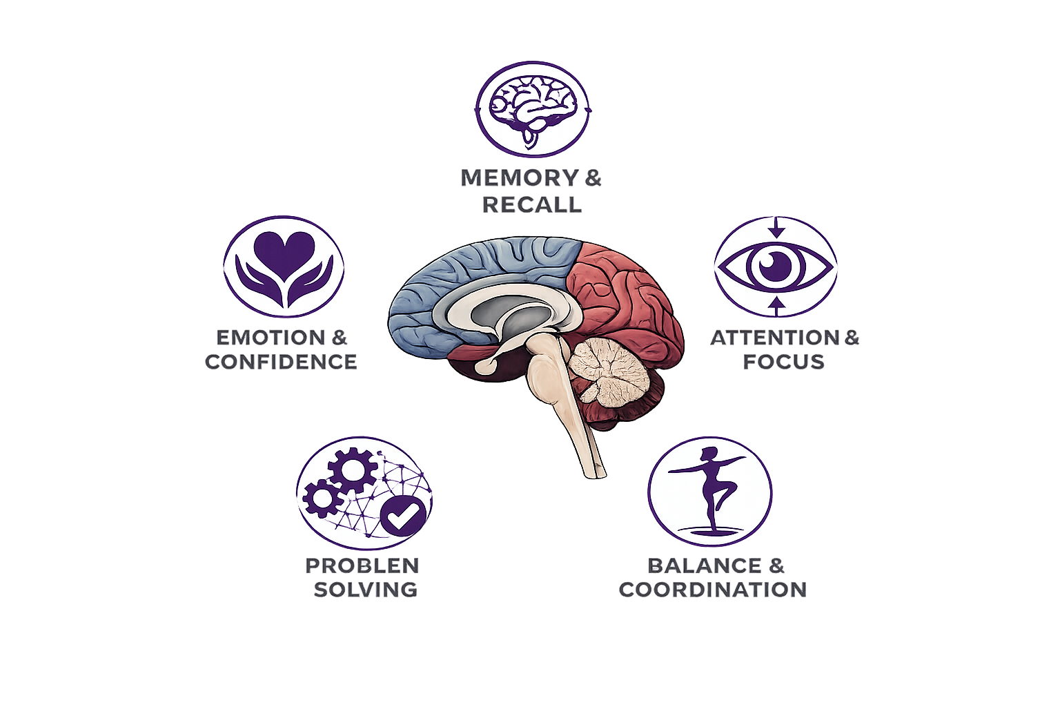 Coordination & Balance → Exercises stimulate the cerebellum and vestibular system, improving motor control.
